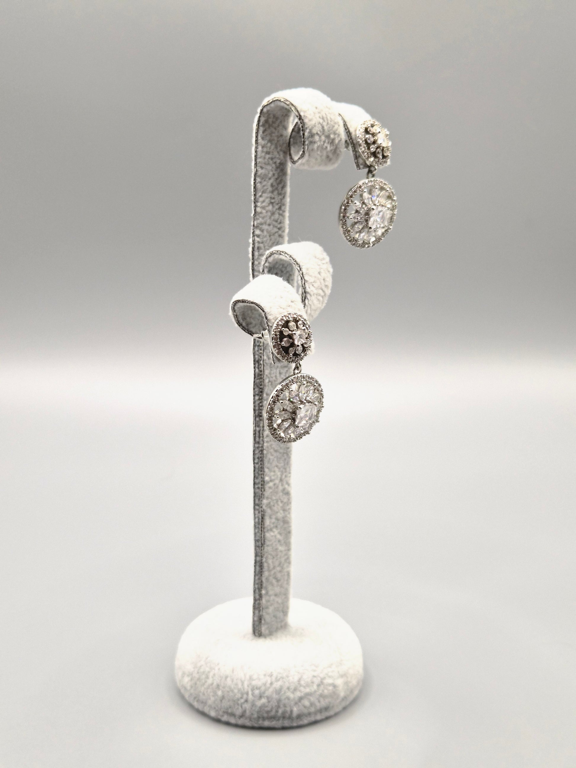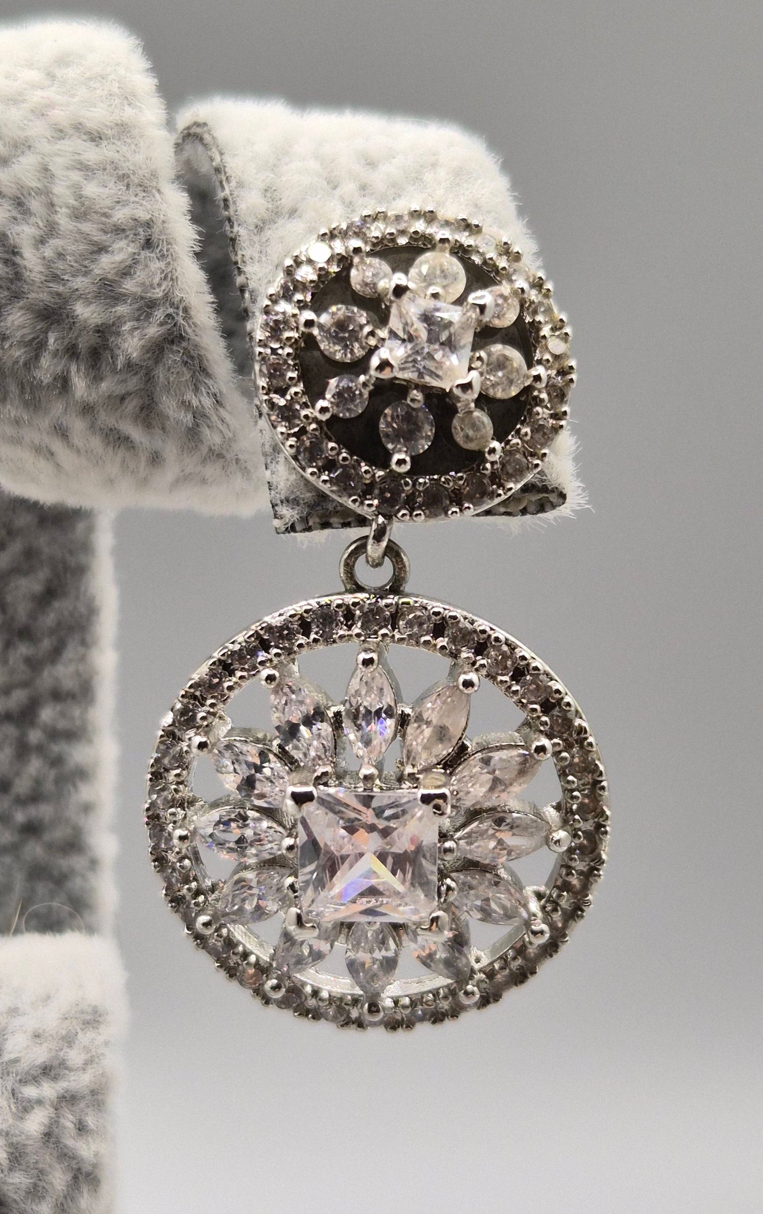 Double Flower Circle Cubic Zirconia Drop Earrings